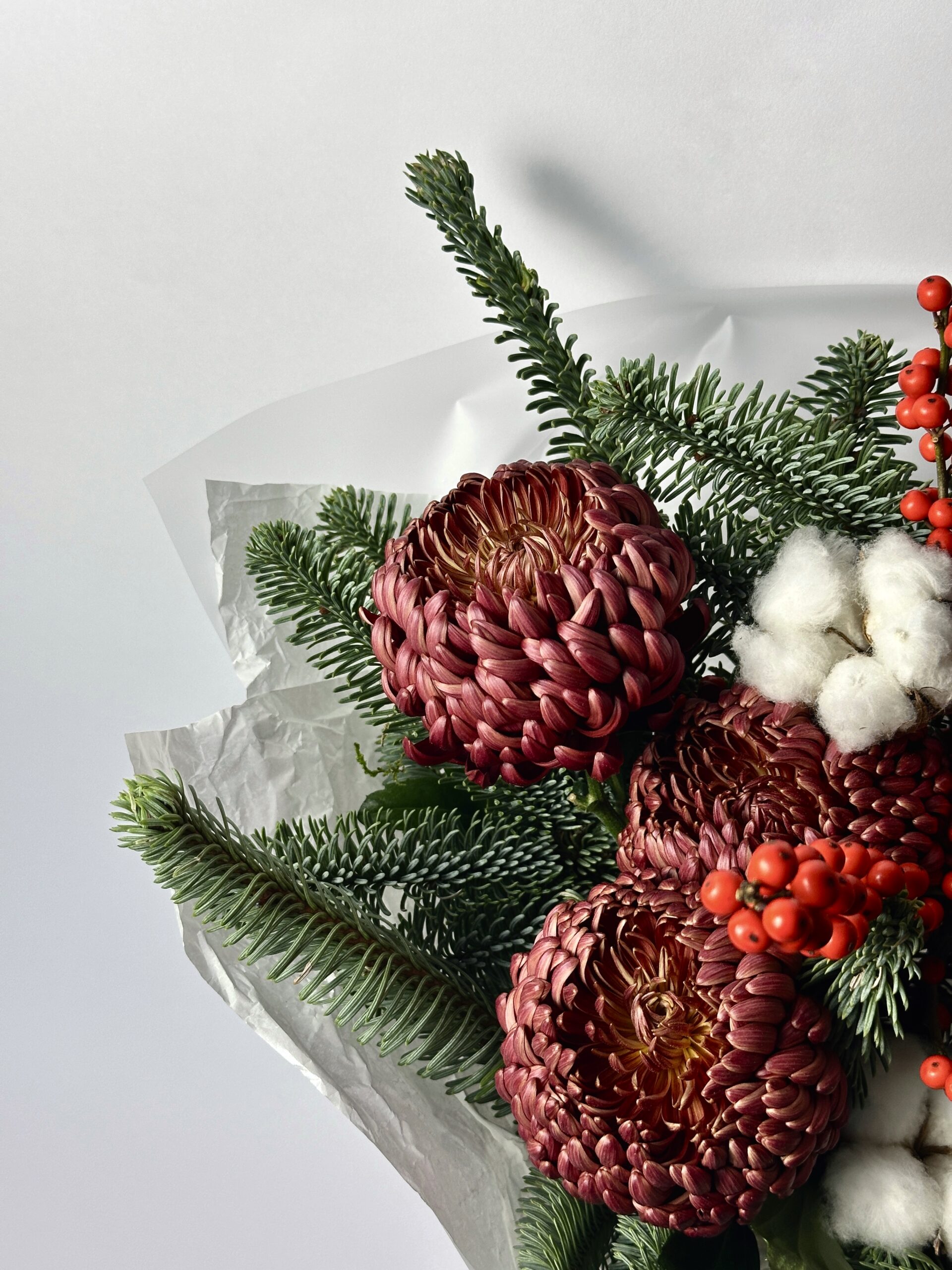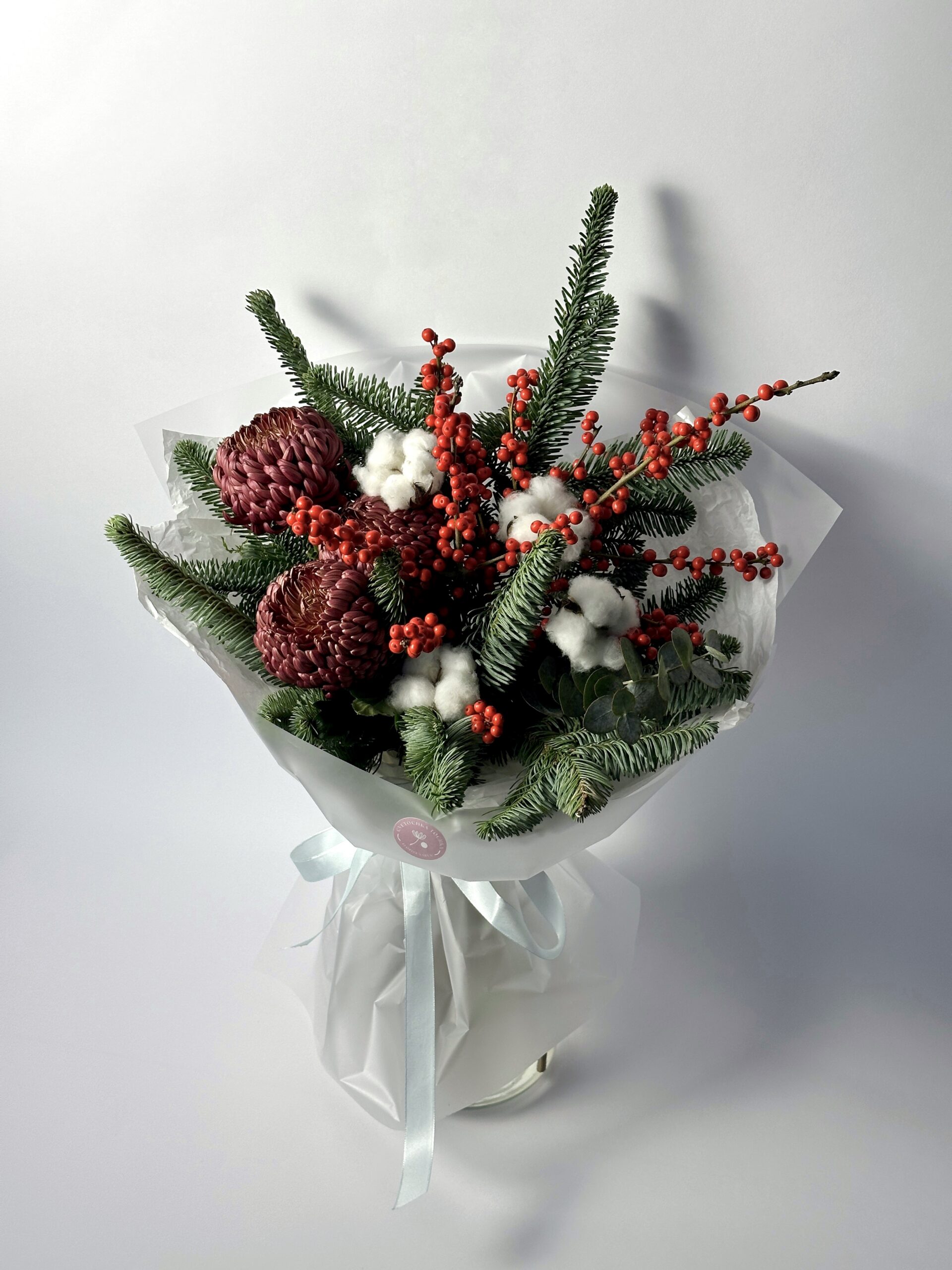 Внимание! В связи с сезонностью бордовая хризантема (Bigoudi) может отсутствовать. В этом случае мы оставляем за собой право заменить её на розу сорта «Экватор» белого или бордового цвета. Замена производится с учётом размера и стойкости цветка.