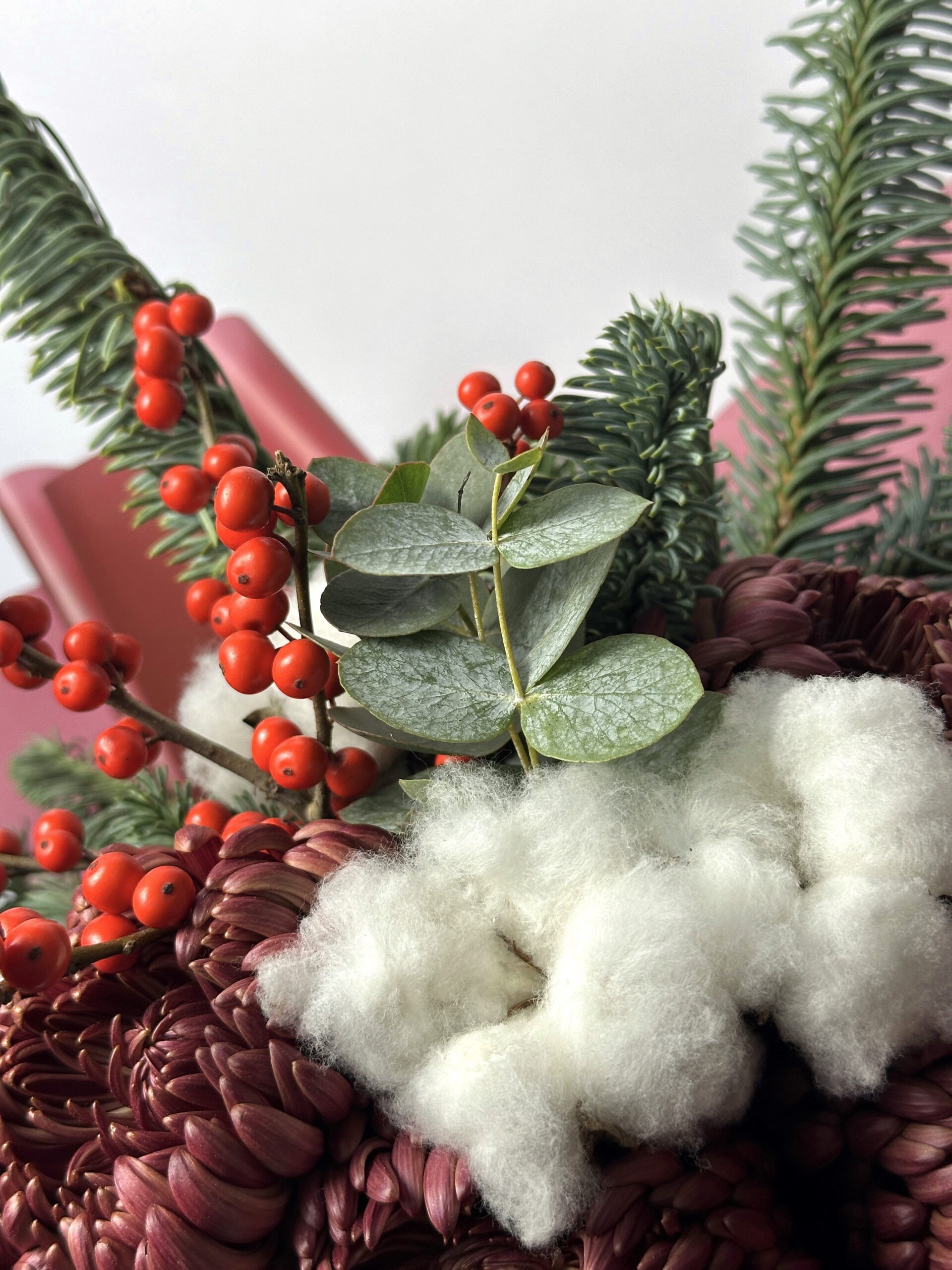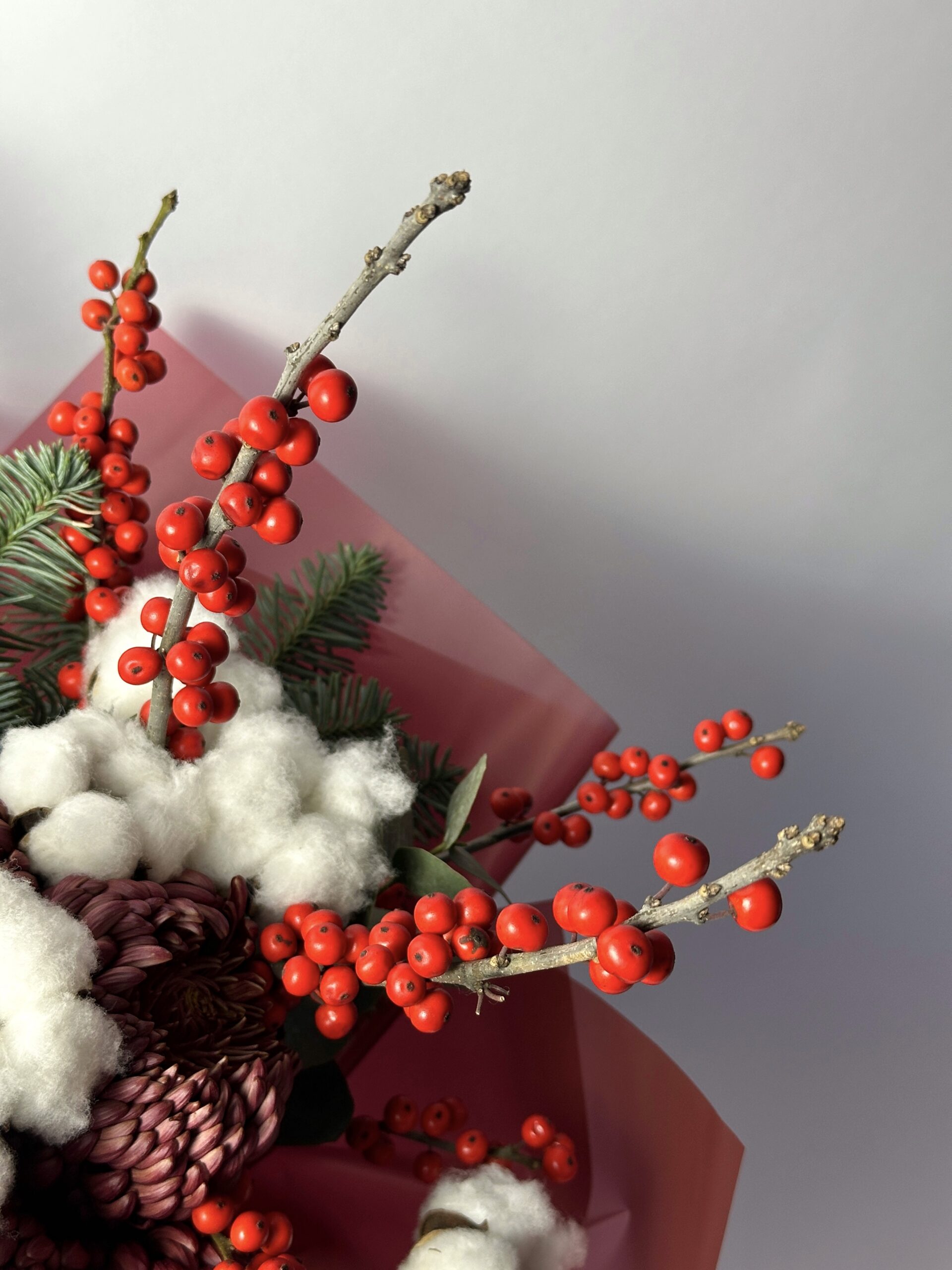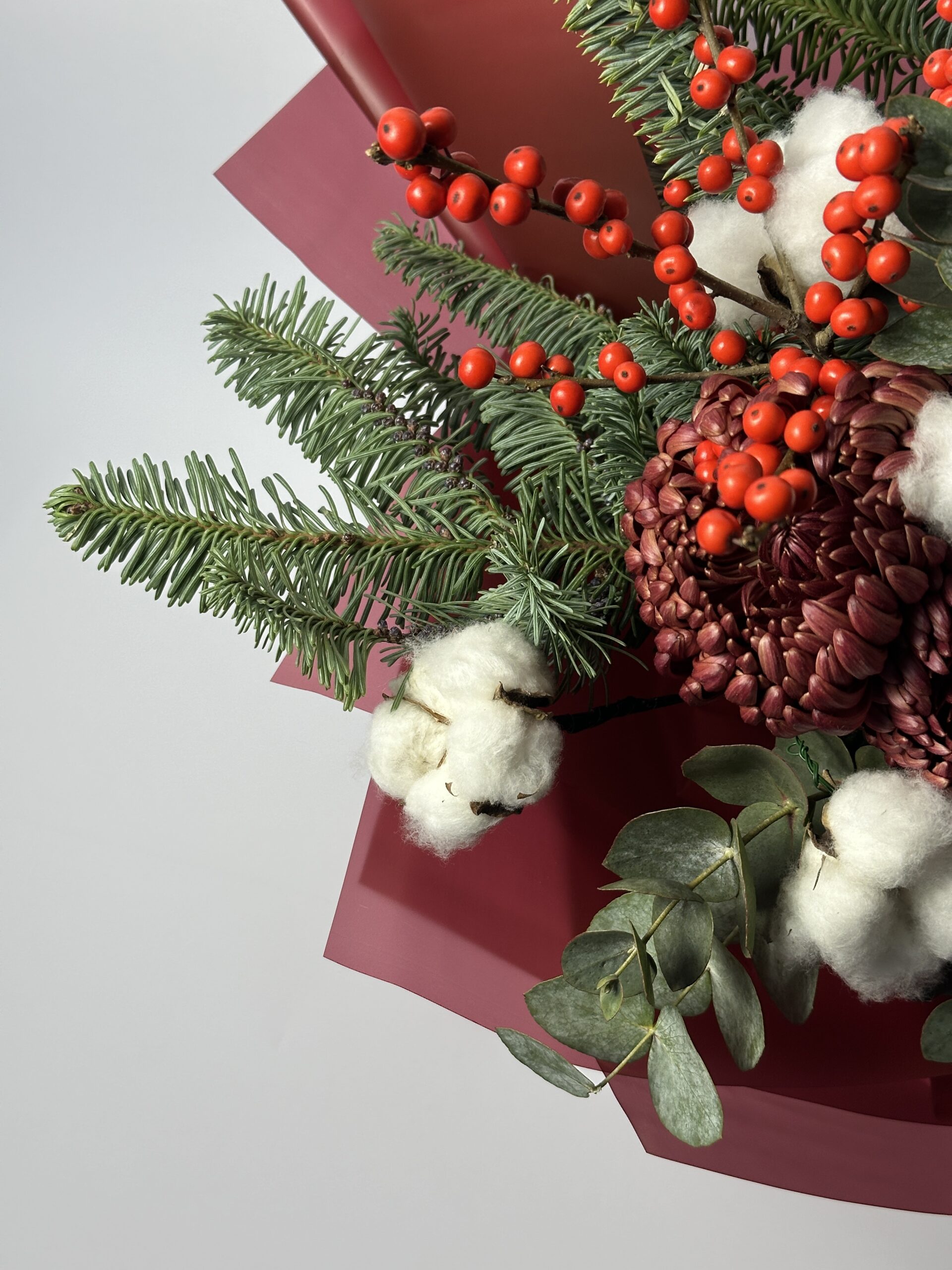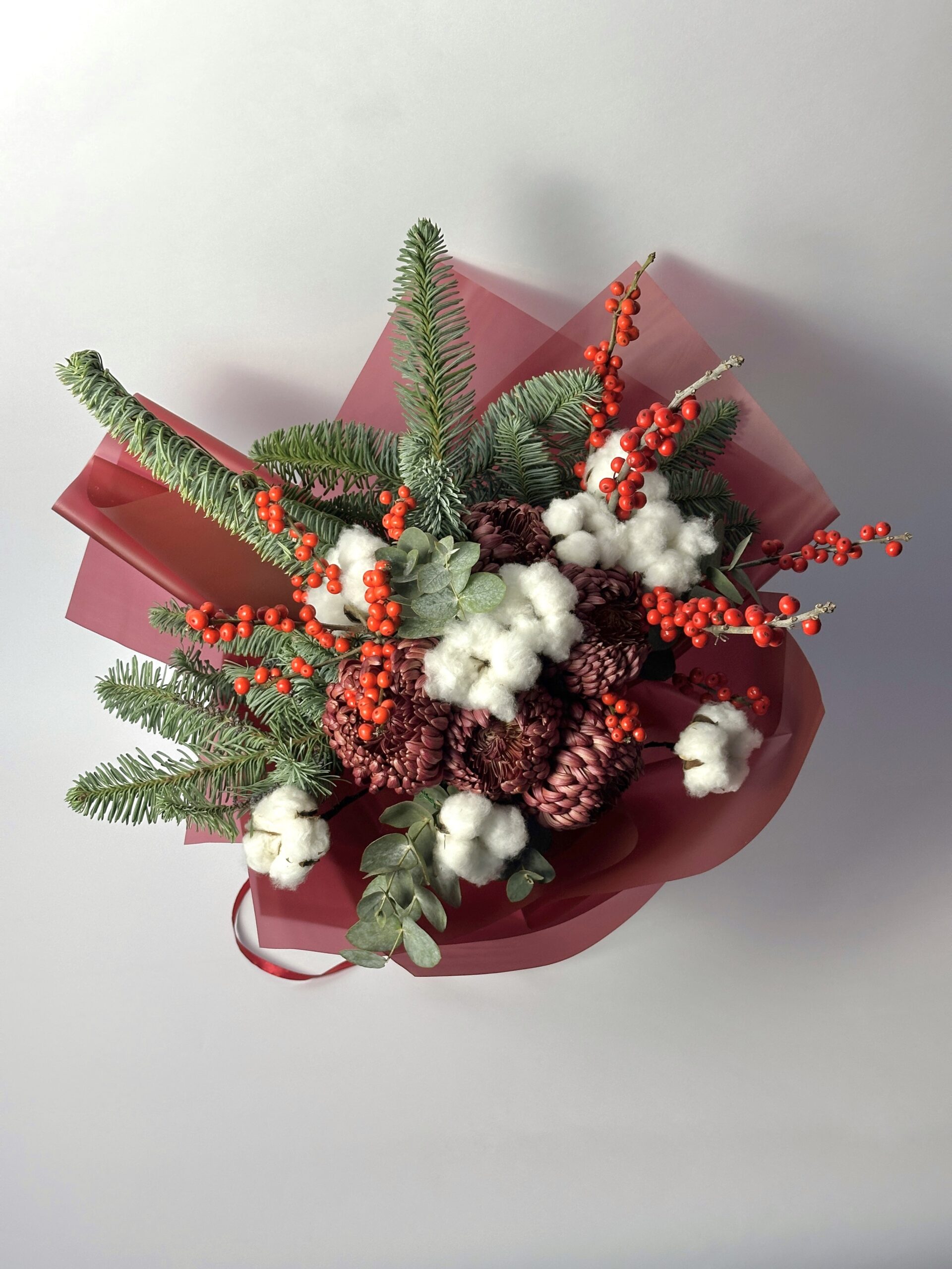Внимание! В связи с сезонностью бордовая хризантема (Bigoudi) может отсутствовать. В этом случае мы оставляем за собой право заменить её на розу сорта «Экватор» белого или бордового цвета. Замена производится с учётом размера и стойкости цветка.