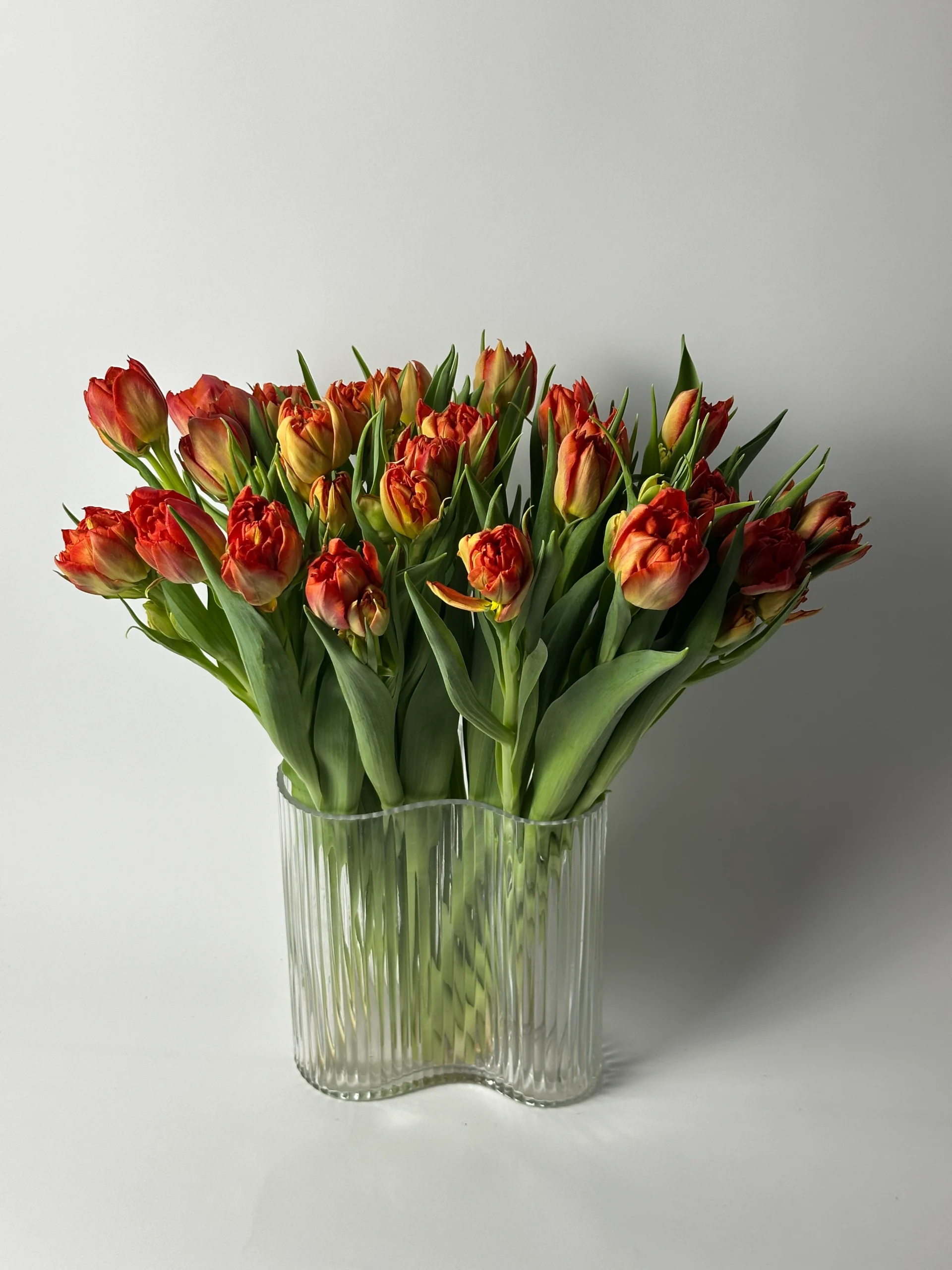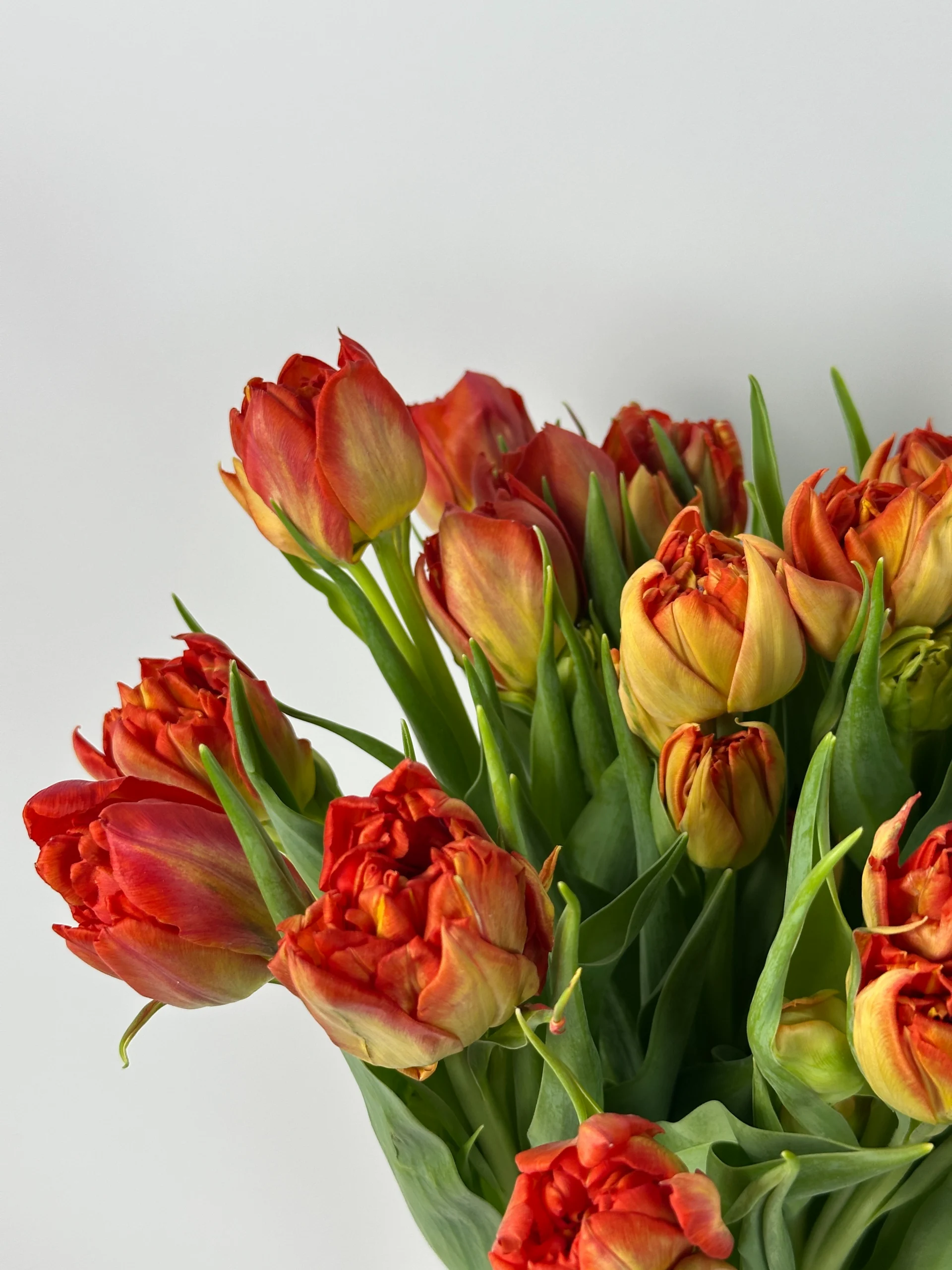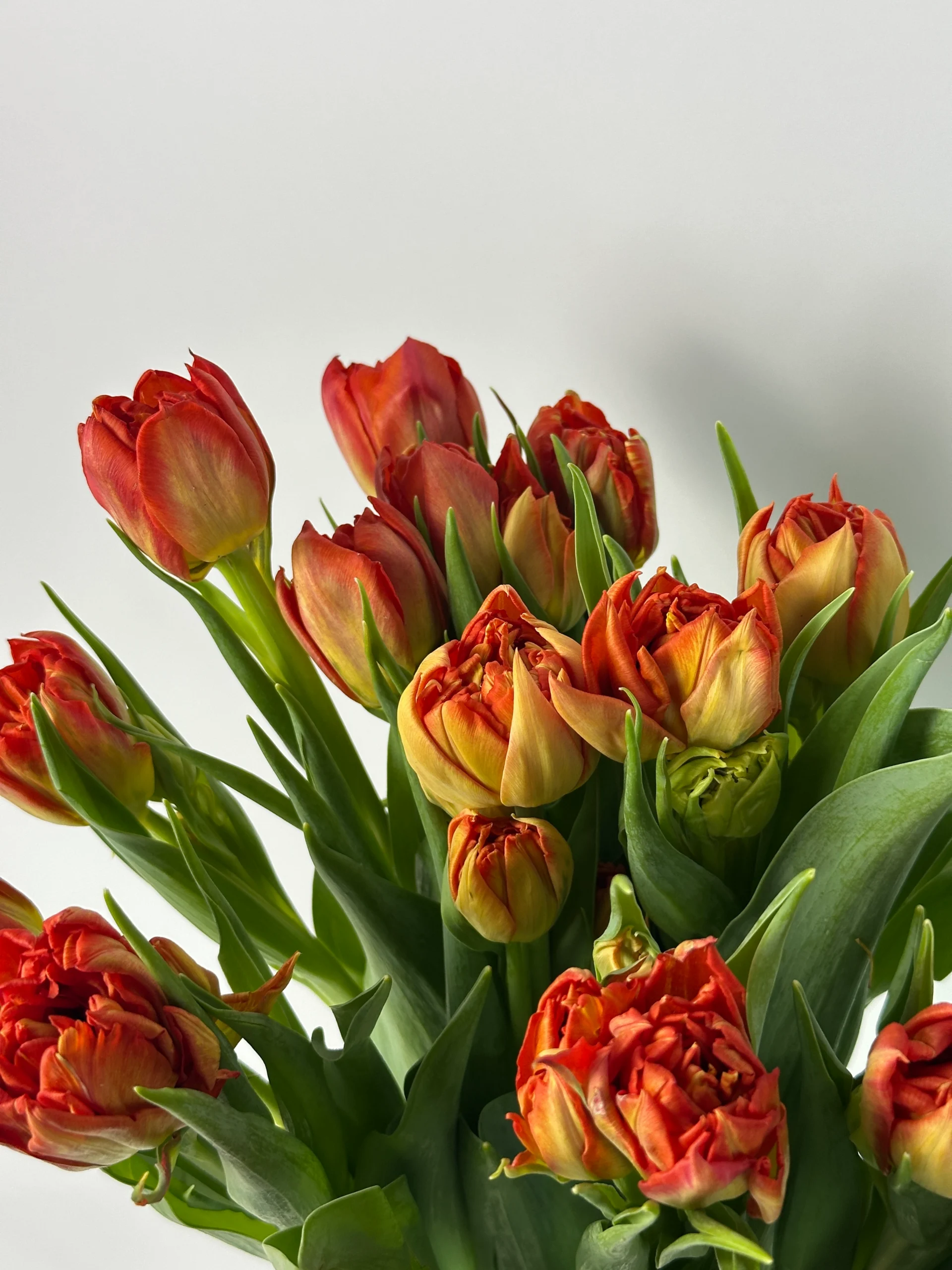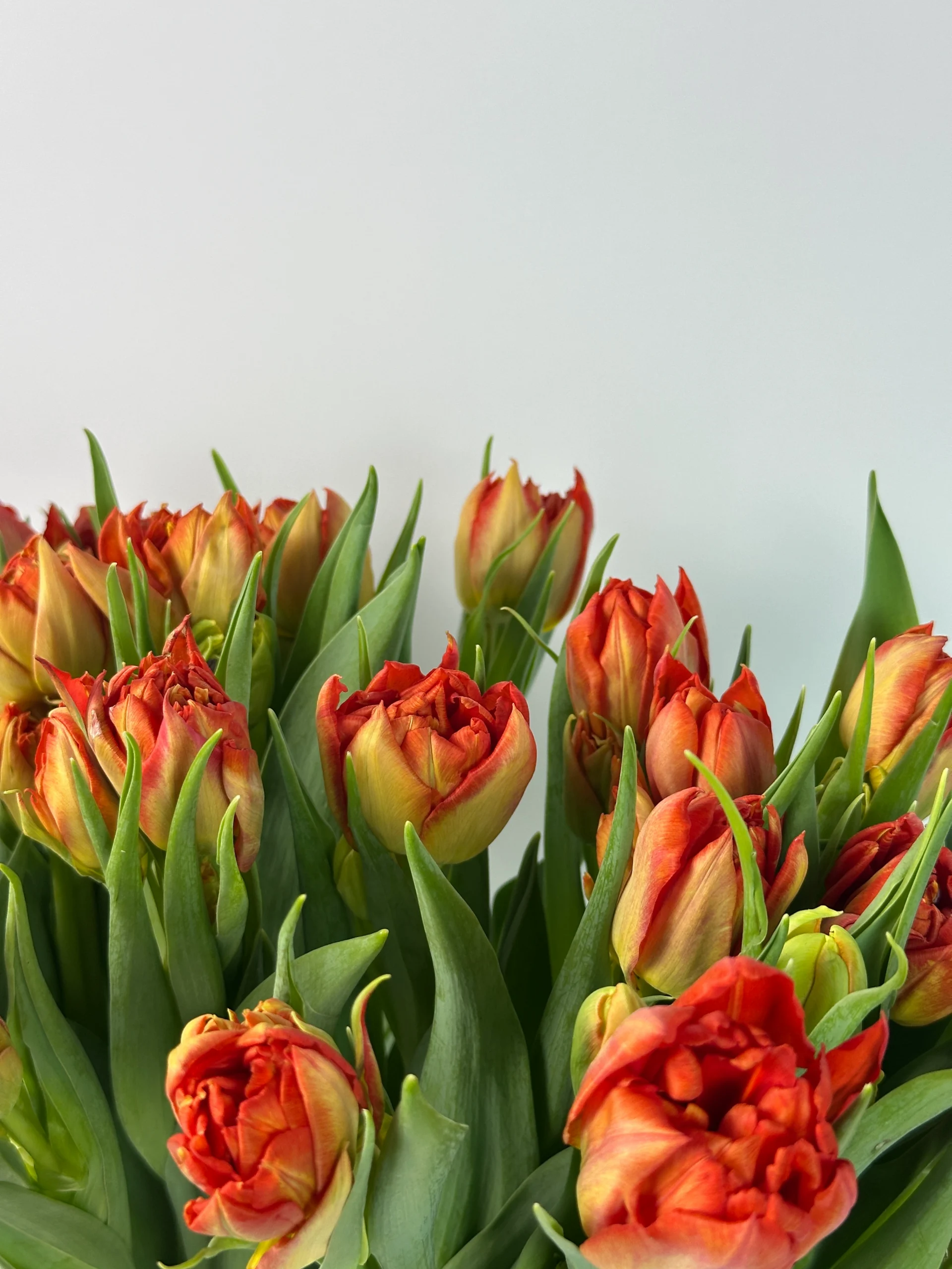 Пионовидные махровые тюльпаны с крупными бутонами в тёплых оранжево-красных оттенках. По мере раскрытия цветы приобретают необычную пышную форму, становясь ещё более эффектными и выразительными.